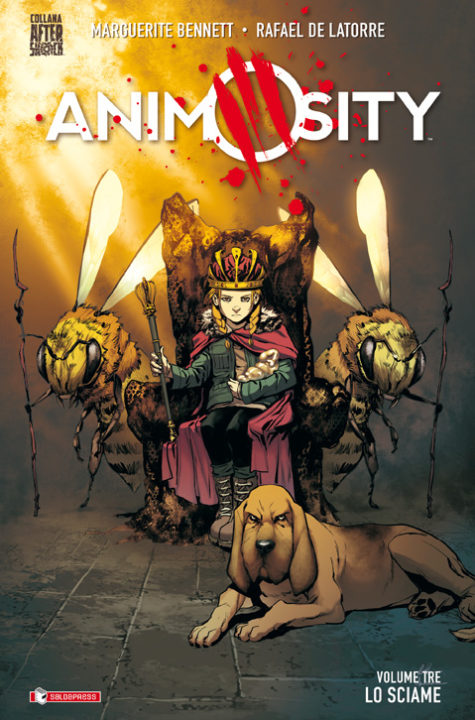 Il racconto di quel viaggio prosegue nel terzo volume di ANIMOSITY, intitolato LO SCIAME (pagg. 120, euro 14.90 brossurato e 19.90 cartonato). Come prevedibile, al centro della scena ci saranno nuovi personaggi: decine di migliaia di api, che devono proteggere la loro Regina da un gruppo di esseri umani e animali che hanno costituito una comunità che si serve del loro lavoro per impollinare le piante. Gli altri animali della spedizione, cioè Bethseda, Zarzamora, Pallas e Potter, oltre a Kyle, che è un essere umano, dovranno affrontare insieme a Jesse e Sandor una prova molto difficile. Saranno costretti a lottare, a rischiare la vita e a considerare – come sempre accade in ANIMOSITY – questioni etico-morali tutt’altro che semplici.