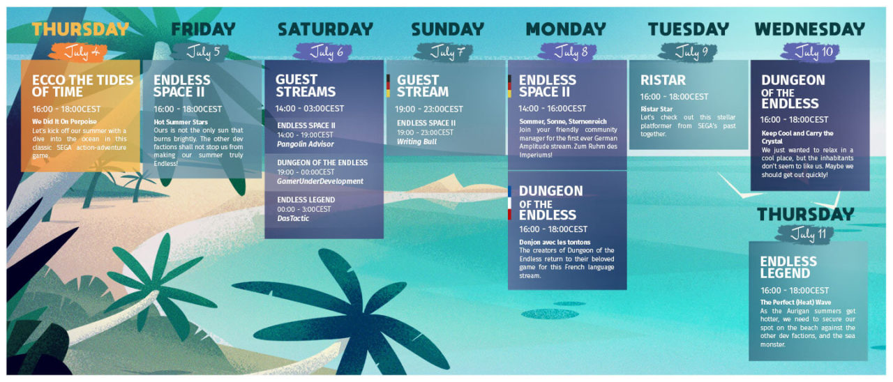 Oggi comincia l’Endless Summer, una lunga settimana di festeggiamenti per celebrare la stagione più calda (in tutti i sensi) dell’anno, i videogiochi e l’universo Endless, ma soprattutto la nostra fantastica community. Rilassati con gli streaming quotidiani, partecipa a divertenti competizioni con gli altri giocatori e scopri tutti i nostri scenari con sfide a tema estivo.