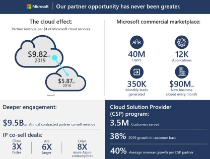 - Il PROGRAMMA DI CO-SELLING lanciato 24 mesi fa, ha già generato 9,5 miliardi di dollari in fatturato co-sell annuale dei partner. I deal IP co-sell si concludono 3 volte più rapidamente, sono 6 volte più grandi e generano un consumo di Azure 8 volte più alto.