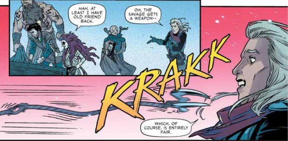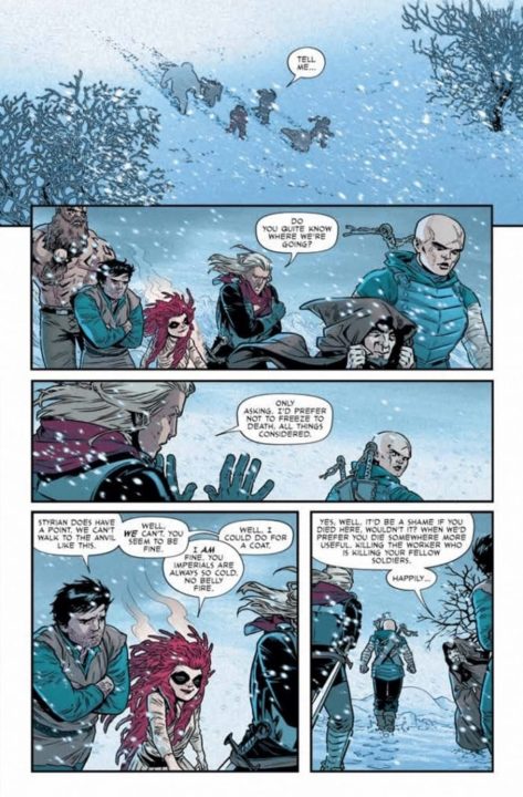 La narrazione si attesta in queste pagine ad un ritmo piuttosto alto: molte sono le scene di combattimento all’interno del secondo numero e i dialoghi tra i personaggi sono serrati e utili per inquadrare meglio la situazione in cui questi versano, sia nel caso specifico che più in generale nel contesto del loro viaggio. D’altra parte però la trama non ha alcuna svolta all’interno di questo volume: i nostri protagonisti semplicemente fanno solo un altro avventuroso passo sul loro percorso, che per quanto sia divertente e interessante da seguire nel merito, non lascerà probabilmente traccia nel quadro generale dell’impresa, quando questa proseguirà.