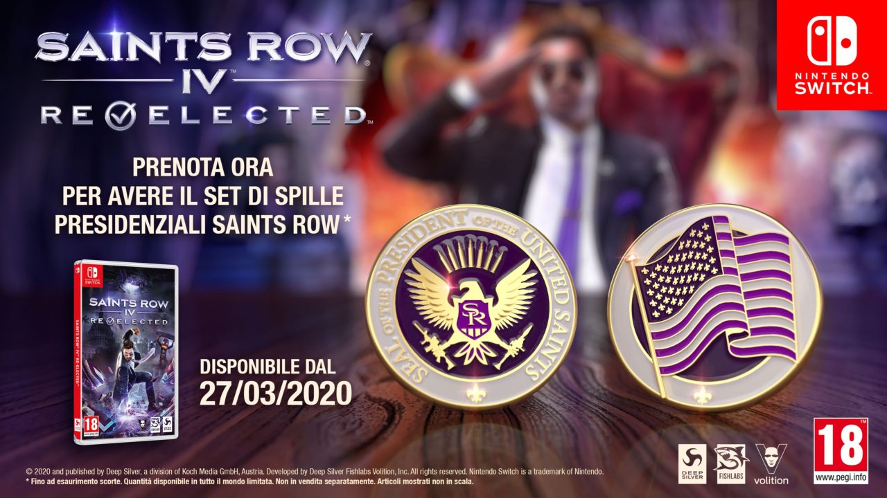 La versione per Nintendo Switch dell’acclamato Saints Row IV includerà ben 25 DLC. I fan di Saints Row che effettuano il pre-order dell’edizione fisica, presso un retailer selezionato, riceveranno anche un fantastico set di Pin Badge presidenziali di Saints Row.