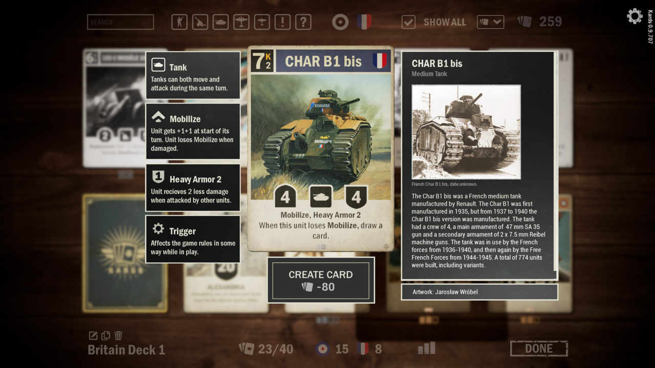 Uno degli aspetti più positivi del titolo è di sicuro l’aspetto grafico visto che tutte le carte sono realizzate alla perfezione con disegni e stile decisamente piacevoli con la possibilità di vedere diverse chicche dell’epoca della Seconda Guerra Mondiale tra mezzi, armi e manifesti realmente esistiti il tutto coadiuvato da tutta una serie di animazioni che si attiveranno quando useremo una determinata carta presente sul tavolo da gioco. In aggiunta a questo le carte permettono anche di scoprire dettagli storici tramite le diverse descrizioni reperibili nella sezione “Collection”. Insieme alle carte poi troviamo un tavolo da gioco minimal ma personalizzabile cambiando alcuni elementi presenti nello scenario andando a selezionare elementi distintivi delle diverse fazioni o tutta una serie di armi ed equipaggiamenti. Piacevole anche la colonna sonora e gli effetti che riescono a far immergere il giocatore all’interno dell’atmosfera di quegli anni anche senza molta varietà di brani.