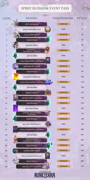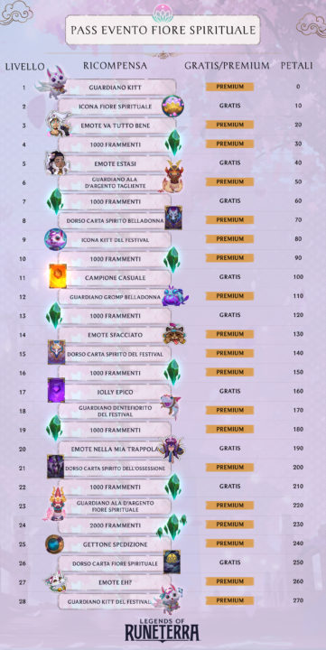 Il Festival del Fiore spirituale è gratuito per tutti i giocatori! Tutti i giocatori hanno accesso alle missioni e al percorso evento del Fiore spirituale (che include icone, emote e un dorso carta), nonché al nuovo Laboratorio. Il Pass evento, che conferisce accesso alle ricompense premium del percorso, come Guardiani e dorsi carta campione, è un acquisto facoltativo.