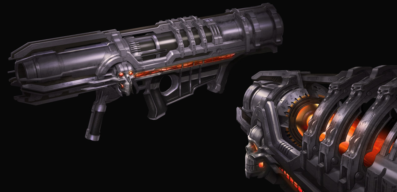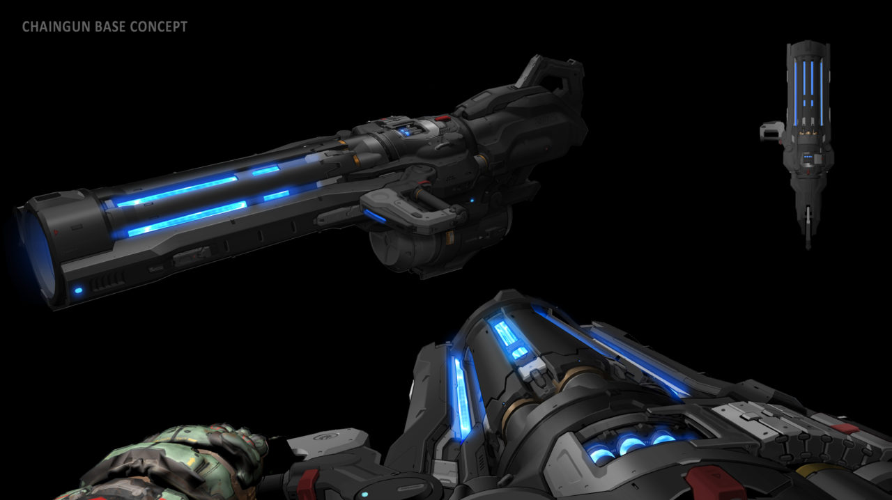 Il mio compito in questo caso era di adattare il BFG alla visuale in prima persona mantenendone intatta la vecchia base. Per questo nuovo aggiornamento mi sono ispirato ai motori e alle motociclette. Ho osato abbastanza, in termini di design, includendo forme organiche di superfici solide ed enfatizzando le animazioni ispirate al movimento dei pistoni/cilindri.