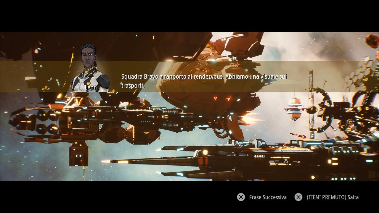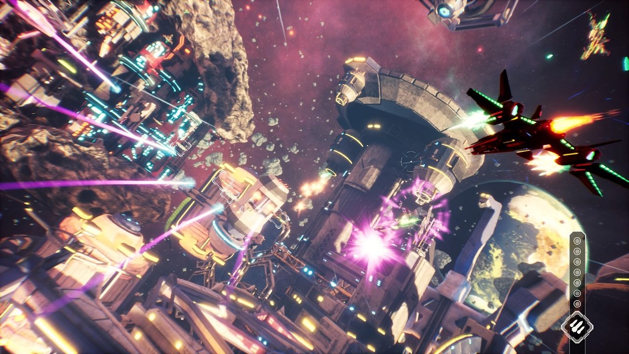 Anche le missioni presenteranno fortunatamente qualche elemento di diversificazione, con alcune strutturate come gare e altre come “bossfights”, alcune con componenti semi-esplorative e con sezioni di movimento libero, ma generalmente la struttura consolidata ci porterà ad affrontare ondate di droni e caccia nemici muovendoci su “binari”, e quindi con capacità di movimento ridotta a ciò che rientra nell’occhio della telecamera non controllata da noi; seguendo la rotta prefissata potremo quindi fare fuoco con l’arma primaria (anche se esiste l’opzione attivabile o disattivabile di “auto-fire), agganciare bersagli e poi rilasciare per sparare missili, attivare un boost momentaneo ed avere manovre evasive di rollìo a destra o sinistra (nel caso della versione testata su PS4 usando i dorsali anteriori del pad, o l’analogico destro flettendo a destra o sinistra). Sostanzialmente questo è tutto ciò che c’è da sapere sul sistema di gioco, che nella sua semplicità riesce a funzionare solo a metà: infatti non serve aggiungere altre meccaniche al core di gameplay, ma il gioco alla lunga soffre di una certa ripetività e di poca inventiva per tenere alta l’immersione del giocatore, che va leggermente scemando man mano che si prosegue; il gioco è strutturato per essere fin troppo accessibile, non avremo un sistema limitato di vite/tentativi per ogni missione ma semplicemente respawneremo dopo un breve delay nel caso venissimo distrutti, non esiste un sistema di punteggio, cosa che potrebbe far storcere il naso ad alcuni fan più hardcore, e gli obiettivi secondari non sempre risultano ispirati ed un buon sostituto a fini completistici.