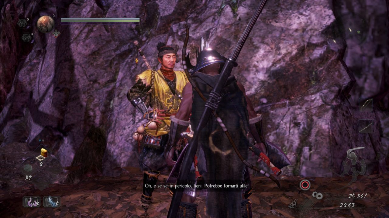 Il gioco ci trasporta subito nella mischia mostrandoci il nostro misterioso alterego virtuale, che in questo secondo capitolo potremo personalizzare a piacere. Figlio di un umano e una yokai redenta, dopo aver assistito alla brutale esecuzione della stessa da parte di una figura demoniaca, il nostro personaggio è diventato uno spietato cacciatore di demoni, armato di un misterioso pugnale dorato donatogli dalla madre prima della sua dipartita. Questo strumento, capace di uccidere i demoni e frammento di una più leggendaria spada sarà nostro compagno di viaggio fin dai primi istanti di gioco, momento in cui il personaggio riceverà una misteriosa lettera che darà il via alla sua avventura portandolo a conoscere Tokichiro Kinoshita, detto la Scimmia, mercante di Pietre dello Spirito e nostro ufficiale ingresso nelle vicende storiche che compongono la trama di Nioh 2 e che seguono l’ascesa di Oda Nobunaga (tra l’altro magistralmente doppiato per l’occasione). Grazie a queste premesse Team Ninja riesce a farci fare un passo all’interno di un regno in piena epoca Sengoku, ma ottimamente raccontata in chiave folkloristica, mescolando l’epopea dei regni Giapponesi in guerra con la mitologia locale, e a creare un titolo complesso e sfaccettato. Nonostante il nostro personaggio sia una classica figura silenziosa, non mancheranno una serie di dialoghi e monologhi a indicarci le vicende che avvengono nel Giappone storico e che creano interazioni spesso degne di nota.