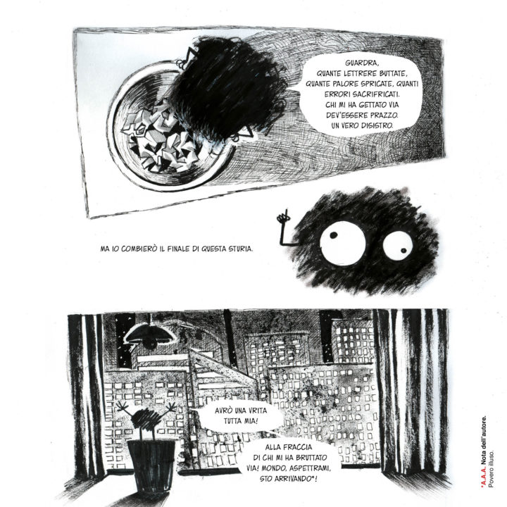 Il protagonista di “Storia di un errore” è proprio un errore, uno sbaglio, un refuso. Nato, o forse accaduto, come ne accadono molti nelle nostre vite. Non ha una forma regolare, non è preciso, ha i contorni indefiniti, è tutto un po’ storto e parla male. La memoria richiamerà, forse, i nerini del buio de “La Città Incantata” di Hayao Miyazaki e qualcosa nel suo aspetto tenero e deforme ce lo fa piacere fin da subito.