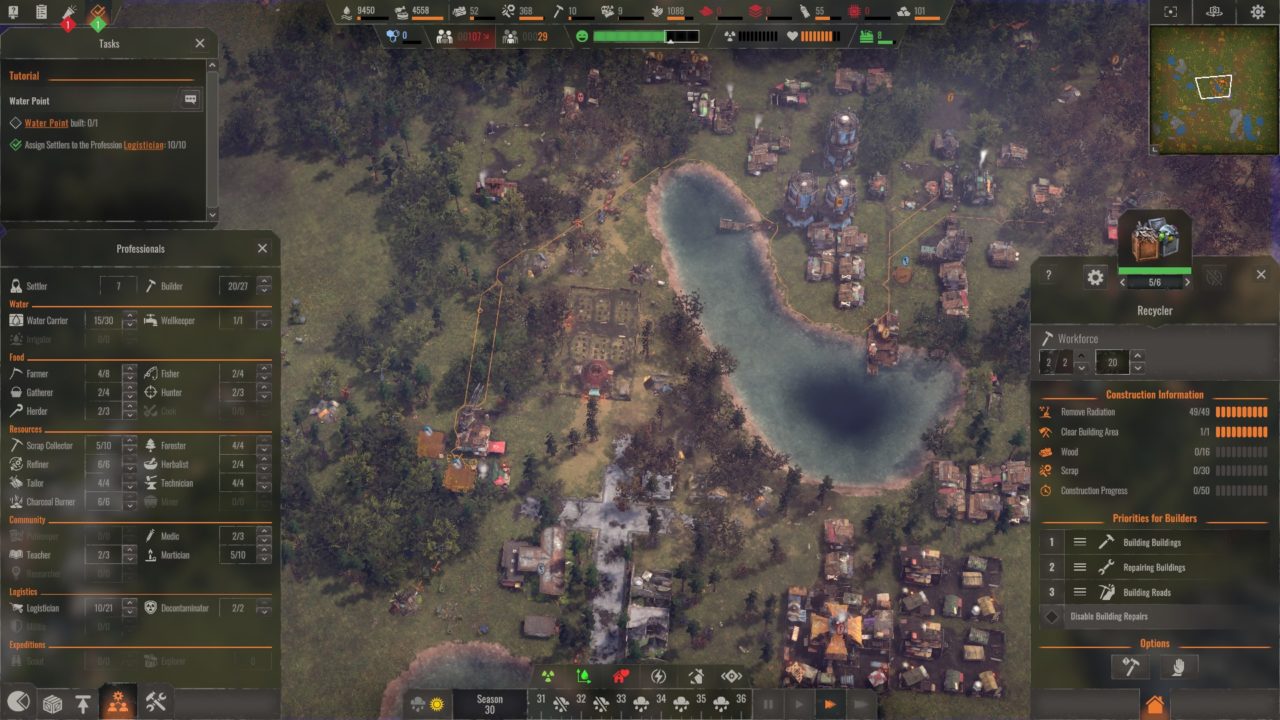 Ed è qui che entriamo in gioco noi, guidati dal nostro mentoreArthur Sawchynal fine creare la nostra personalissima società bizzarra a metà tra una tribù preistorica ed una cittadina della prima metà del XX secolo. Per fare ciò bisognerà iniziare dal soddisfacimento dei bisogni primari, permettendo ai nostri cittadini di avere accesso alle risorse di acqua e cibo, per poi andare a focalizzarsi e specializzarsi pian piano in ogni singolo aspetto della nostra colonia. E quando intendo ogni singolo aspetto, intendo OGNI SINGOLO ASPETTO! Dalla raccolta e raffinamento dei materiali del vecchio mondo, al confezionamento delle vesti protettive necessarie per sopravvivere in quest’ambiente avverso, passando per taglialegna, fattorie, fonti d’energia e chi più ne ha più ne metta! Ma chiaramente non potremo avere accesso fin da subito a tutti i numerosissimi edifici disponibili in Endzone – A World Apart, in quanto parte della conoscenza del genere umano o risulta essere approssimativa o, addirittura, è andata perduta per sempre; sarà dunque necessario istruire e improntare verso la ricerca scientifica la nostra comunità, una volta concessale una vita quantomeno dignitosa.