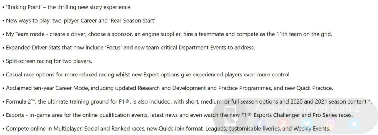 Stando a quanto riportato in rete il corsistico uscirà sia su old-gen che next-gen il prossimo 16 luglio e vedrà al suo interno diverse novità rispetto al passato: innanzitutto sarà presente una modalità Storia chiamata “Break Point”, una nuova modalità “Carriera” per due giocatori e la modalità “Real-Season Start”. Torneranno poi le vetture della Formula 2 che serviranno come introduzione al gioco, inoltre sarà presente una sezione eSport, un aspetto su cui Codemasters punterà molto.