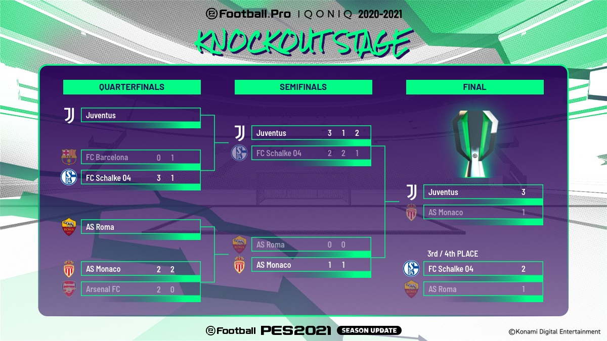 Konami Digital Entertainment B.V. annuncia i risultati del Knockout Stage del torneo eFootball.Pro IQONIQ, che ha visto la Juventus detronizzare i campioni in carica AS Monaco con una vittoria iconica ai tempi supplementari.