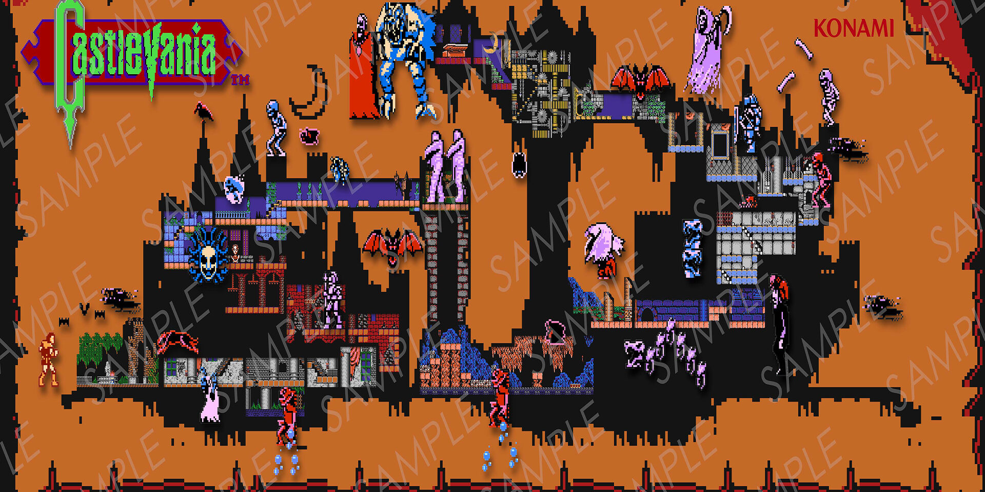 Pixel art originale, appositamente creata per questa collezione. L’opera è basata sulla mappa del Castello di Dracula che appare nel gioco originale Castlevania, con l’aggiunta degli stage e le creature che li popolano.