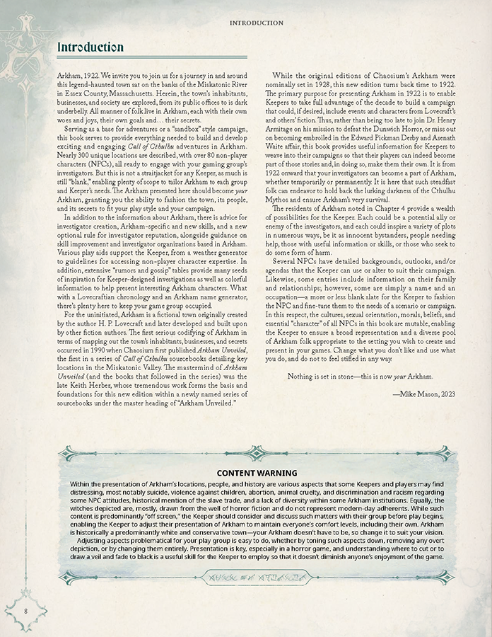 In definitiva, Arkham per Il Richiamo di Cthulhu Settima Edizione rappresenta uno dei supplementi urbani più completi mai pubblicati per un gioco di ruolo investigativo horror. Non è soltanto una guida alla città più famosa del Mythos, ma un manuale capace di trasformare lo spazio urbano in narrazione emergente, dove ogni vicolo può nascondere una verità impossibile e ogni indagine lascia cicatrici permanenti. È un volume che richiede tempo e dedizione, ma che restituisce un livello di immersione straordinario, confermando Arkham come uno degli scenari più potenti e inesauribili mai concepiti per il gioco di ruolo.