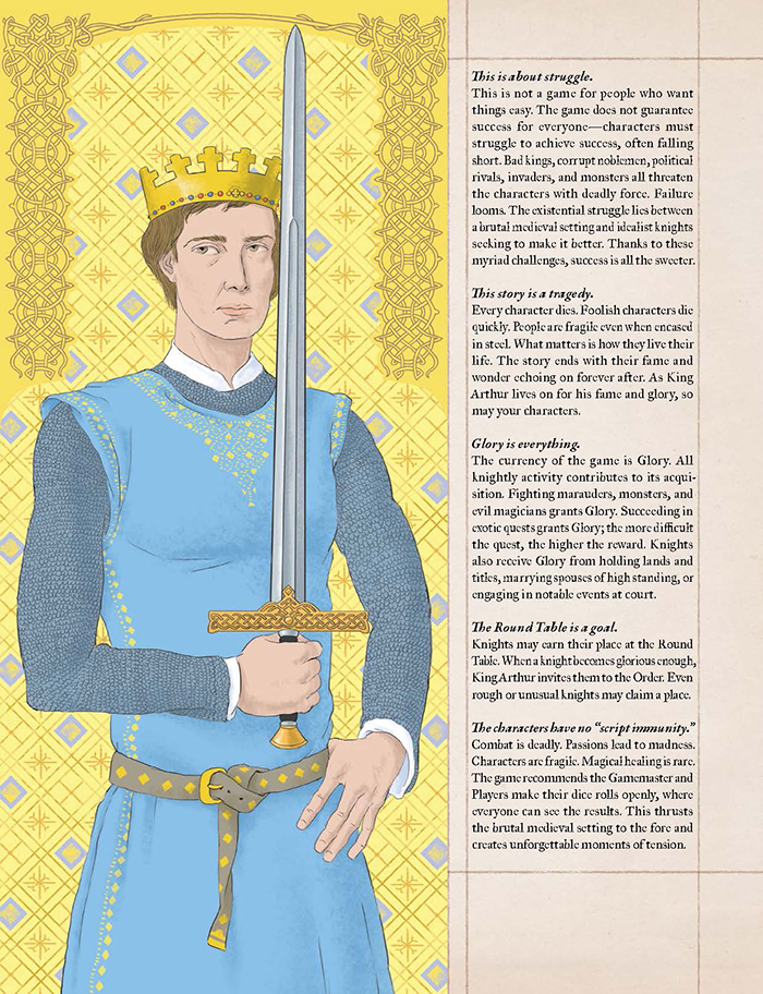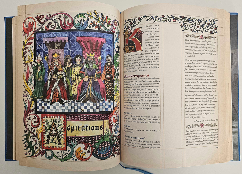 Con Aspirations, Onore e Gloria, il manuale chiarisce ulteriormente che la progressione in Pendragon non passa attraverso l’accumulo di poteri, ma attraverso l’ascesa sociale e simbolica. La distinzione tra Gloria e Onore è centrale, perché introduce l’idea che il successo possa essere vuoto o persino dannoso se non accompagnato da una condotta coerente. Gli Ideali e l’aspirazione alla Tavola Rotonda non sono presentati come obiettivi finali, ma come tensioni costanti che orientano le scelte e generano conflitti tra personaggi con visioni diverse della cavalleria.