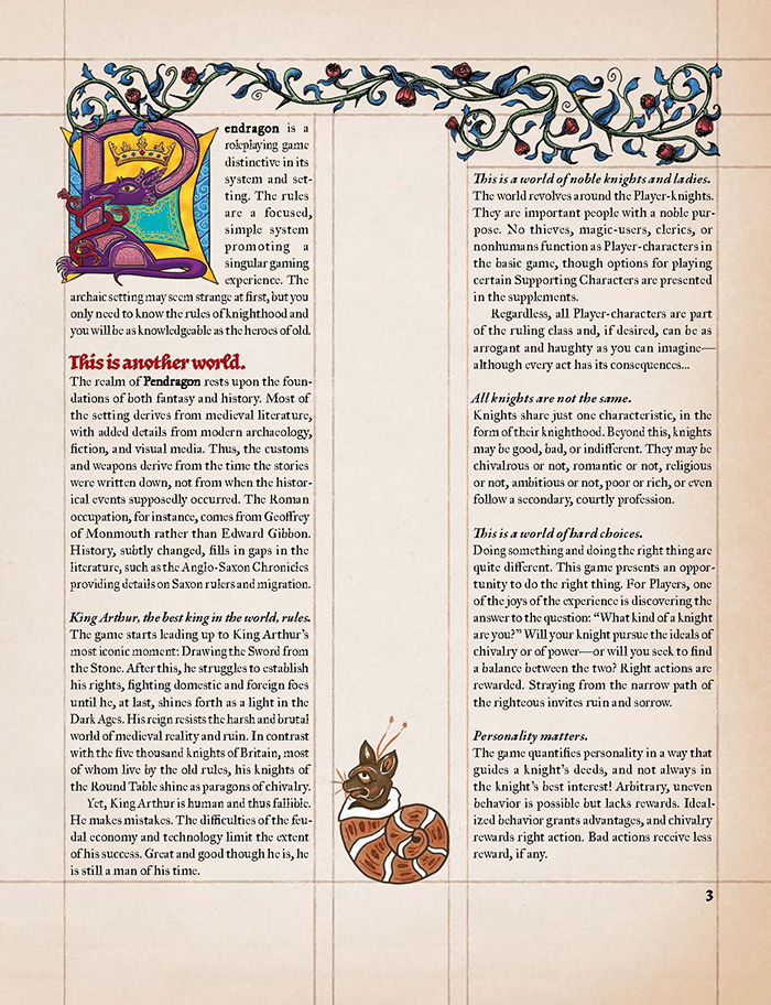 Uno dei punti di forza più evidenti di questo Core Rulebook è la quantità di contesto messo a disposizione, non come semplice lore da assimilare, ma come linguaggio condiviso per interpretare un ruolo sociale preciso. Pendragon non chiede solo di interpretare un personaggio, chiede di abitare una condizione, quella del cavaliere, con tutto il suo carico di privilegi, obblighi e contraddizioni. La società descritta non contempla l’uguaglianza, la gerarchia è un fatto naturale, e l’obbedienza al proprio signore rimane un cardine morale prima ancora che politico. In questo quadro, l’ascesa di Artù e la progressiva affermazione dell’idea di cavalleria come tensione verso il bene comune diventano un processo lento e imperfetto, fatto di resistenze, compromessi e fallimenti. La suddivisione cronologica in grandi ere del ciclo arturiano funziona come una bussola narrativa, chiarendo fin da subito che Pendragon non nasce per raccontare una singola impresa, ma per accompagnare intere generazioni di personaggi, fino a trasformare la campagna in una vera saga dinastica.