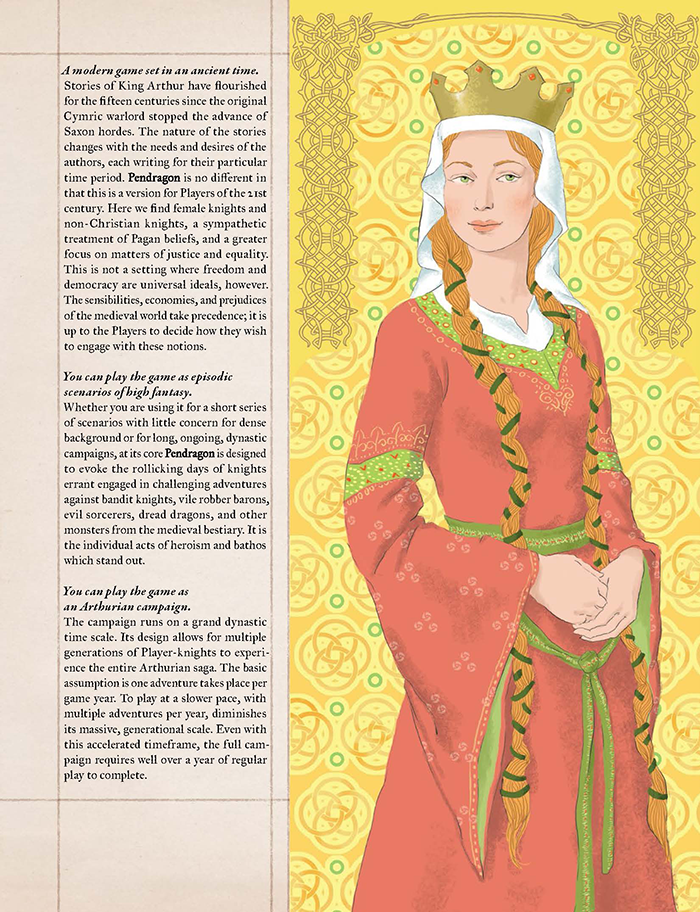 Particolarmente riuscita è anche la gestione del tema delle cavaliere. Il manuale adotta un linguaggio inclusivo e tratta “knight” come termine neutro, proponendo diverse possibili reazioni della società di gioco senza imporre una lettura univoca. Ancora una volta, Pendragon fornisce strumenti e contesto, lasciando al tavolo la responsabilità di decidere quale versione di Britannia mettere in scena, senza mai perdere di vista il cuore del gioco, la cavalleria come istituzione, con tutte le sue tensioni morali.