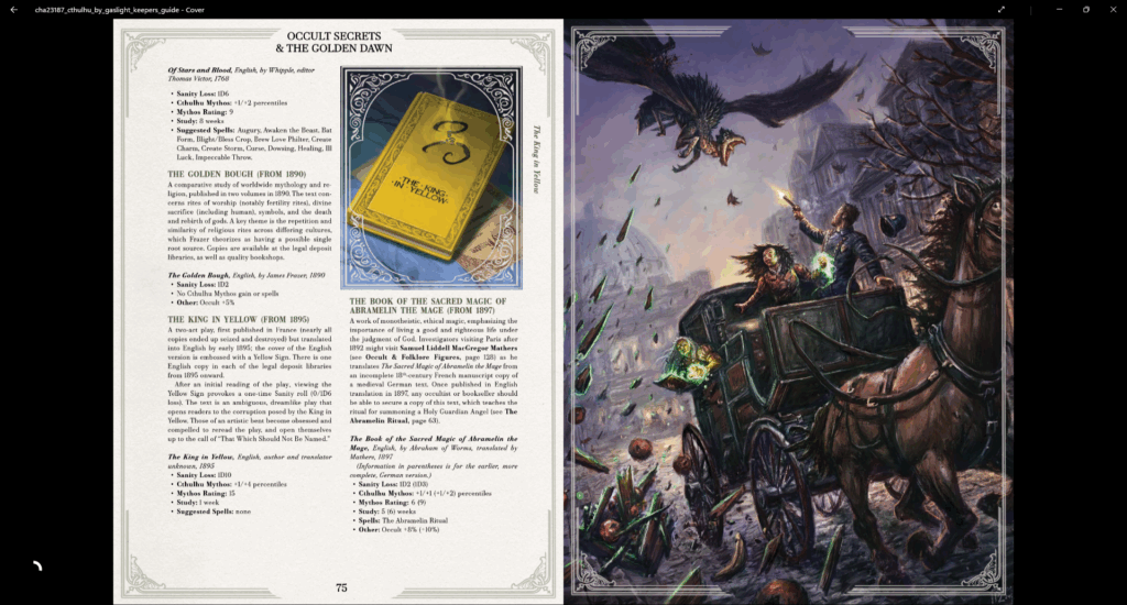 Ma non è solo il dolore della storia a nutrire le pagine. Il secondo capitolo, “Occult Secrets & The Golden Dawn”, spalanca le porte all’esoterismo vittoriano: viene presentata in dettaglio l’Ordine Ermetico dell’Alba Dorata, completo di struttura gerarchica, rituali magici, incantesimi ermetici, tomi proibiti e persino regole opzionali per il combattimento astrale. È un affresco profondo dell’occulto storico e fantastico, dove il confine tra scienza, fede e pazzia si fa labile. È anche il punto d’ingresso perfetto per Custodi che vogliano esplorare un tono più mistico e simbolico, in stile Carnacki o Penny Dreadful.