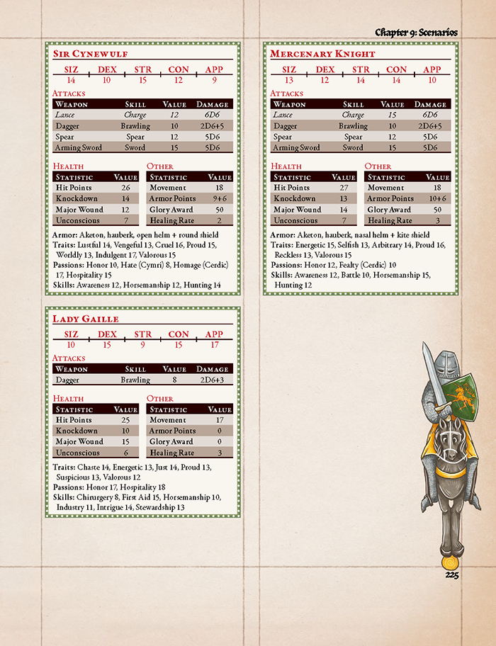 La guerra, inevitabile in un’epoca di instabilità e conquista, viene trattata come esperienza collettiva e come prova morale. Le regole per le battaglie permettono di gestire scontri su larga scala senza trasformare il gioco in un wargame, mantenendo il focus sulle scelte dei singoli cavalieri, sul rischio personale e sulla gloria conquistata o perduta. Anche qui il manuale dimostra di comprendere perfettamente il cuore di Pendragon, la battaglia non è solo uno scontro armato, ma un momento che può definire una vita e una reputazione.