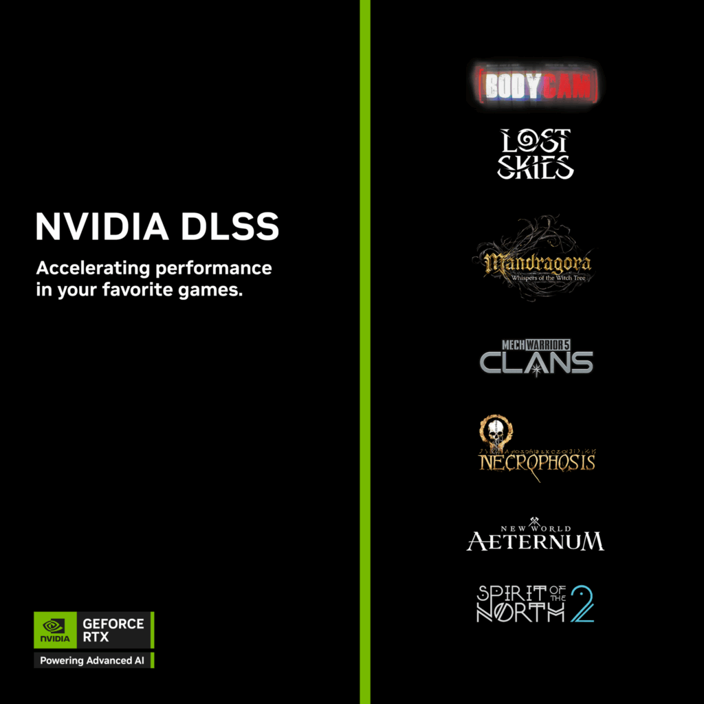 Nelle prossime settimane arriveranno diverse novità, tra cui il supporto a DLSS 4 con Multi Frame Generation, che migliorerà significativamente le prestazioni in MechWarrior 5: Clans, New World: Aeternum e Spirit of the North 2. Inoltre, DLSS Super Resolution è già disponibile o in arrivo a breve su Bodycam, Lost Skies, Mandragora: Whispers of the Witch Tree e Necrophosis.