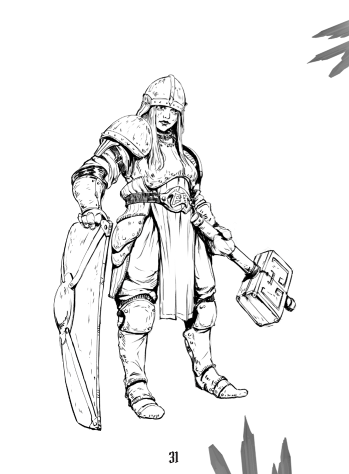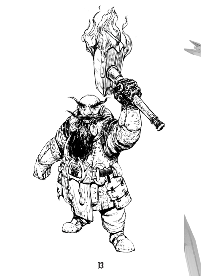 Il cuore del gioco è un motore meccanico semplice ma raffinato, derivato dal Black Hack 2e. Le meccaniche ruotano attorno a test sugli attributi con un dado a venti facce, con successi critici e fallimenti disastrosi che danno sapore e incertezza ad ogni azione. Ma è il contesto in cui queste regole si muovono che le rende straordinarie. Ogni personaggio è un nano ed ogni giocatore contribuisce alla costruzione del proprio clan, completo di storia, credo, vessillo ed eredità. È un’idea potentissima: non solo si interpreta un individuo, ma si dà voce a un’intera cultura. Questo legame tra giocatore e fiction è raro e prezioso.