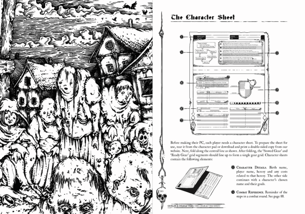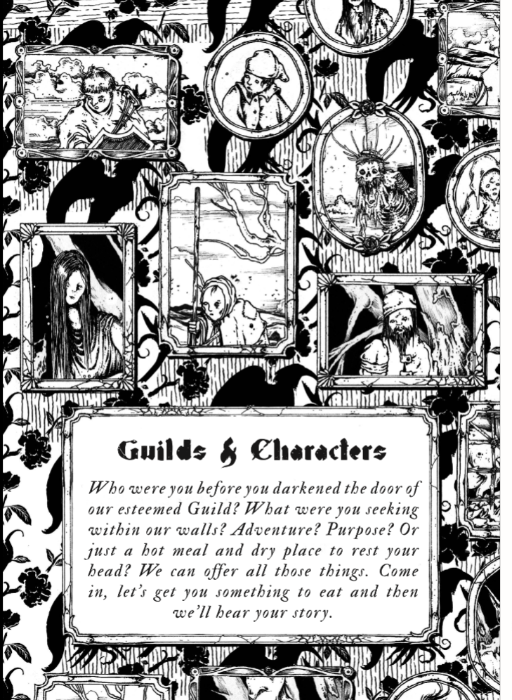 Il manuale si apre con una Introduzione che stabilisce subito il tono: questo è un gioco cupo, brutale, ma intessuto di poesia nera. Seguono le prime sezioni dedicate al setup del gioco, in cui il Game Master può scegliere se organizzare una Cronaca (campagna), una One-shot, o una Guild Marches, modalità simile alle West Marches in cui più giocatori e master si alternano in sessioni episodiche che condividono un mondo sandbox coerente. Tutto parte dalla Gilda: essa è il cuore pulsante del gruppo e del mondo, registrata su una apposita scheda (Guild Sheet) dove si segnano gerarchia, risorse, alleanze e reclute.
