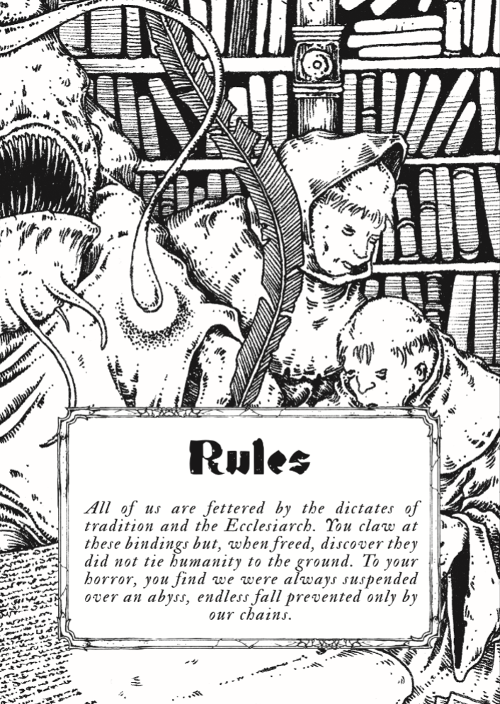 La parte più intensa del manuale è forse quella intitolata Heresy. Qui il gioco si tinge di teologia deviata, filosofia grottesca e mitologia invertita. I Foundational Stories narrano la creazione e la distruzione del mondo, mentre gli dèi, i Traitor Gods, sono divinità ambigue, affascinanti, spaventose. La fede è un’arma a doppio taglio, e la Chiesa del Cadavere Divino un colosso burocratico e inquisitorio che cerca di mantenere un ordine ormai privo di significato. Le abilità occulte, in questa sezione, diventano veri e propri atti di poesia oscena: evocare un dio, infettare un territorio, vedere attraverso gli occhi dei vermi.