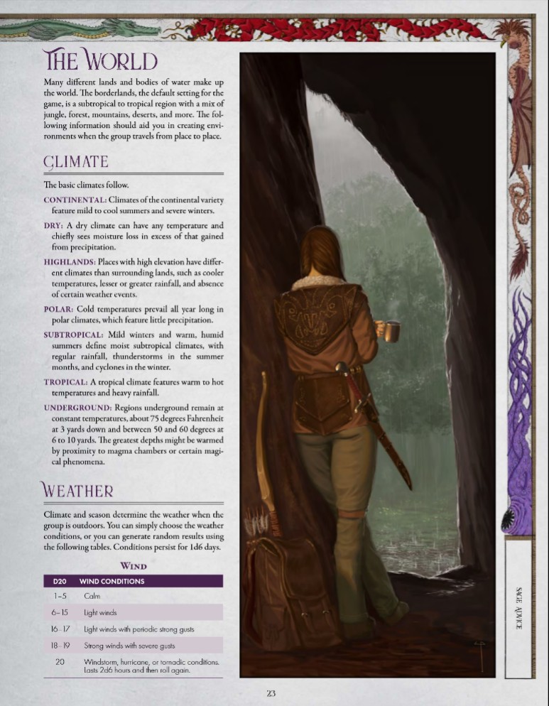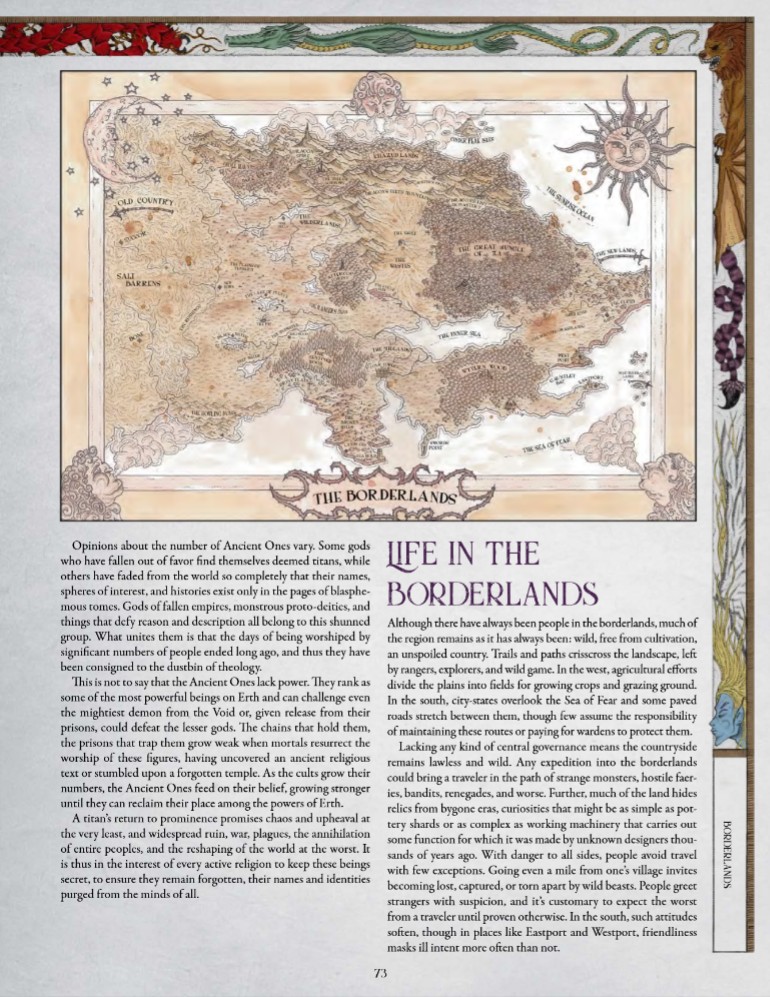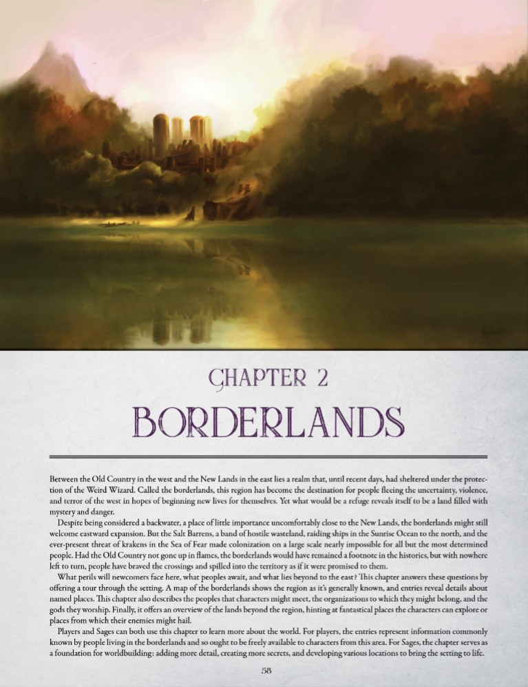 Il contesto narrativo viene ripreso e rafforzato, il mondo di Shadow of the Weird Wizard è un luogo in crisi, attraversato da guerre, cataclismi e migrazioni forzate, in cui intere popolazioni si spostano verso le Nuove Terre (New Lands), territori abbandonati da una figura leggendaria e ambigua, il Weird Wizard. Le Terre di Confine (Borderlands) diventano così il cuore pulsante dell’ambientazione, uno spazio instabile e permeabile, ideale per raccontare storie di esplorazione, conflitto, opportunità e ridefinizione dei rapporti di potere. Secrets of the Weird Wizard non si limita a ribadire questo scenario, ma lo rende giocabile, offrendo al Sage strumenti per trasformare il contesto in una fonte costante di tensione narrativa.