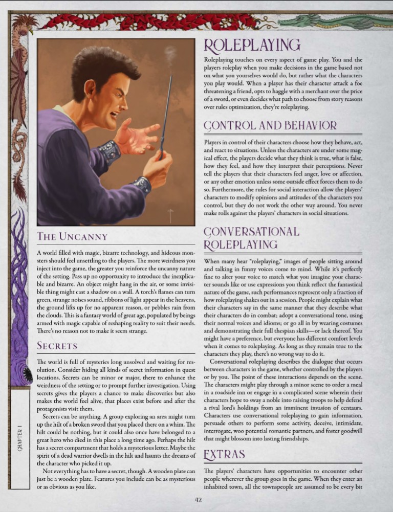 L’improvvisazione viene trattata in modo estremamente pragmatico, senza retorica o idealizzazioni. Secrets of the Weird Wizard non chiede al Sage di “essere creativo” per forza, ma gli fornisce strumenti concreti per non rimanere bloccato, tabelle di supporto, suggerimenti su come integrare le idee dei giocatori, criteri per scegliere l’esito più logico quando il regolamento non offre una risposta immediata. Anche il ricorso al combattimento come strumento narrativo viene normalizzato, non come soluzione pigra, ma come mezzo per rimettere in moto la storia quando il ritmo cala, sempre all’interno di una cornice coerente.