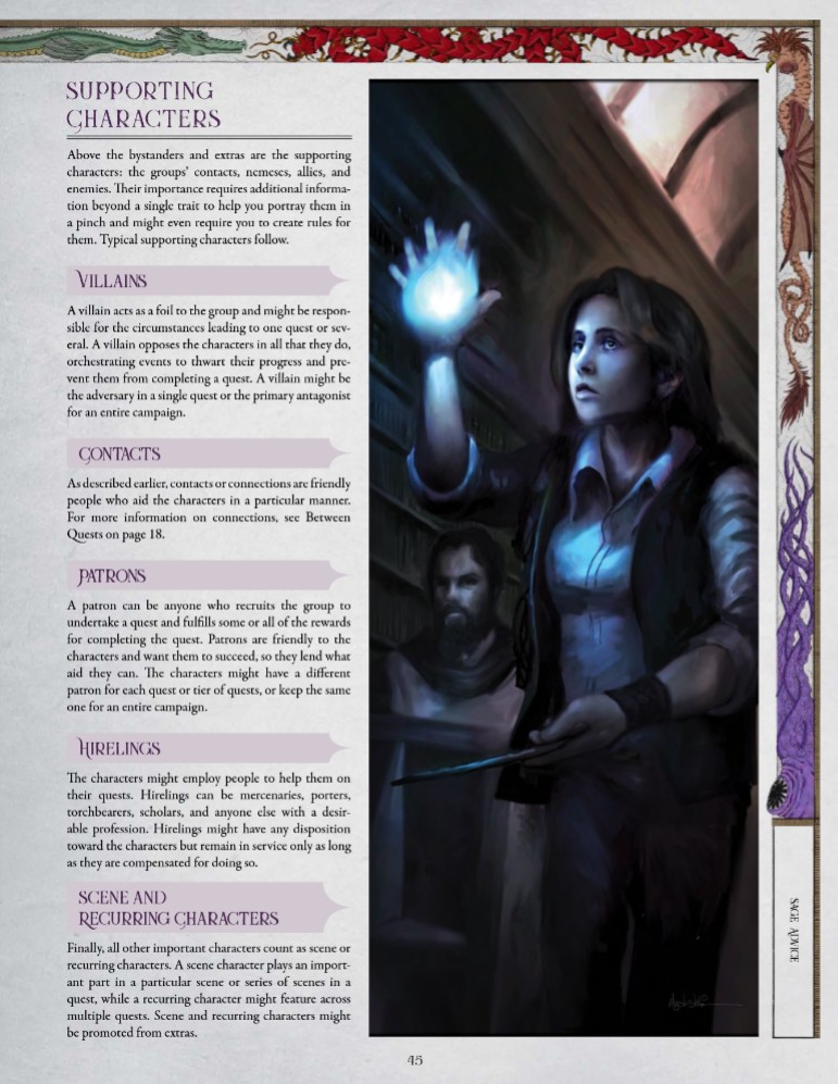 Grande attenzione viene riservata alla struttura delle missioni (quest), presentate come unità narrative autosufficienti, pensate per essere giocate in una singola sessione, idealmente tra le tre e le cinque ore. Questa scelta di design, lungi dall’essere limitante, favorisce campagne modulari, composte da episodi con un inizio, uno sviluppo e una conclusione chiara, capaci però di intrecciarsi in archi narrativi più ampi. La suddivisione in atti (acts) e scene (scenes), il costante richiamo al ritmo e alla gestione del tempo, rendono questa sezione particolarmente preziosa per chi conduce campagne in live, one shot o stagioni episodiche, senza rinunciare alla profondità tematica.