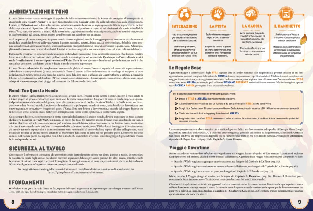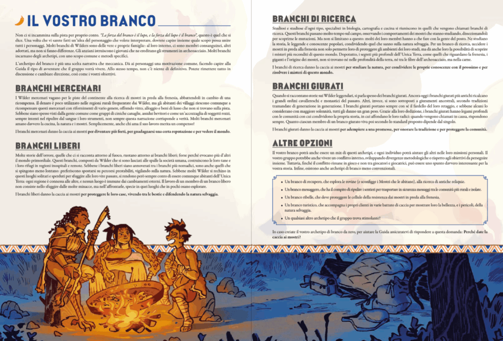 La struttura narrativa del gioco è scandita in quattro fasi: Interazione (creare le connessioni con il mondo circostante), La Pista (esplorazione e raccolta), La Caccia (combattimento), Il Banchetto (cucina e mutazione), a cui si aggiungono i Viaggi ed Il Downtime (riposo, cura, relazioni, addestramento). Il ciclo di gioco favorisce un ritmo naturale che alterna tensione e rilassamento, azione e introspezione. Particolarmente innovativo è il Banchetto: dopo ogni caccia, il branco cucina insieme la carne del mostro e la consuma. La qualità del piatto, gli ingredienti usati e le emozioni provate durante la preparazione influenzano gli effetti ottenuti, che vanno da bonus temporanei a Tratti permanenti. Il cibo diventa così ponte tra il combattimento e la crescita personale, tra il corpo e l’identità. Ma il Banchetto è anche un momento di dialogo, condivisione e legame affettivo tra i membri del gruppo, reso ancora più significativo dalla struttura sociale del gioco. Il Branco, infatti, non è solo un’unità di gioco cooperativa, ma una vera e propria identità collettiva dotata di un nome, una filosofia e una relazione specifica con l’Unica Terra. Il manuale presenta diverse tipologie di Branco: come quelli Mercenari, quelli Giurati, quelli Liberi e quelli di Ricerca, che possono essere usati come archetipi o combinati fra di loro. Ogni tipo di branco influenza la narrazione, suggerisce priorità morali ed orienta l’evoluzione del gruppo nel tempo, aggiungendo una dimensione ideologica all’esperienza. Le decisioni prese al Banchetto non riflettono solo gusti e preferenze, ma anche il modo in cui il branco intende abitare il mondo: con rispetto, con rabbia, con speranza o con fame.