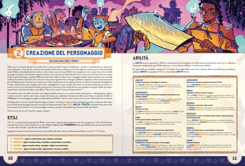 Il sistema di gioco si basa sul Wilderfeast System, che fonde abilmente narrazione e meccanica. Ogni personaggio è costruito attorno a quattro Stili (Possente, Preciso, Rapido e Scaltro), combinabili con dodici Abilità per risolvere le Prove. Il giocatore tira un numero di d6 pari al valore dello Stile, aggiunge il bonus dell’Abilità, e affianca un Dado Azione, un d8 per gli umani, un d20 per i mostri, entrambi per i Wilder. Questo approccio consente una risoluzione semplice ma ricca di sfumature, in cui il successo meccanico è sempre accompagnato da una lettura qualitativa. Il risultato del Dado Azione, infatti, influisce sulla narrazione, determinando colpi di scena, conseguenze inattese o evoluzioni del conflitto, anche in caso di successo.