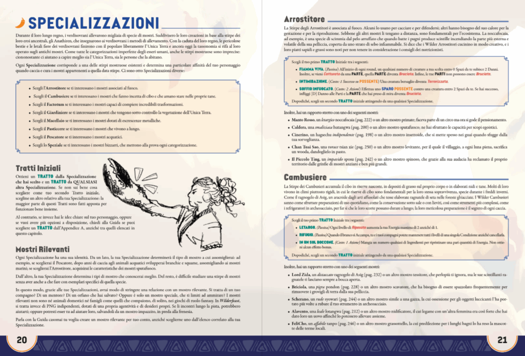 Un elemento narrativo e meccanico di grande fascino in Wilderfeast è proprio la presenza dei Mostri Rilevanti, creature con cui ogni Wilder ha stretto un legame personale nel proprio passato e che possono diventare compagni ricorrenti nel corso della campagna. A differenza di semplici famigli o animali da compagnia, questi mostri non sono subordinati ai personaggi: sono PNG che possiedono personalità autonome, desideri propri, paure, valori morali e persino un’evoluzione narrativa indipendente. Ogni Specializzazione fornisce un Mostro Rilevante predefinito, che rappresenta non solo una fonte di ispirazione per le origini del personaggio, ma anche un nodo emotivo che può riemergere come alleato, minaccia, guida spirituale o memoria dolorosa. Meccanicamente, la loro presenza può offrire vantaggi situazionali, conoscenze uniche o persino influenzare l’Armonia del Branco. Ma è sul piano simbolico che questi legami brillano davvero: i Mostri Rilevanti rappresentano “l’altra parte” del personaggio, quella mostruosa ma anche più autentica, che sfugge al controllo umano ed invita a riconciliarsi con la propria alterità.