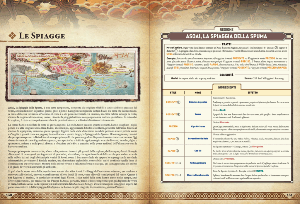 La varietà dei mostri è notevole. Il bestiario principale comprende decine di creature suddivise per biomi e caratteristiche mutagene: volanti, anfibi, infuocati, cristallini, tossici, e altro ancora. Ogni mostro ha almeno due Tratti speciali, un comportamento base, una condizione emotiva o ambientale dominante ed una Tabella Ingredienti da cui derivano bonus specifici per il Banchetto. Ciò che rende unico ogni scontro è che i mostri non sono mai “cattivi”: spesso sono creature sofferenti, infette dalla Frenesia o semplicemente in difesa del proprio territorio e l’attacco da parte del branco è una scelta da motivare e sostenere narrativamente. Il gioco non spinge mai verso la violenza automatica: ogni scontro può essere anche evitato o risolto in altro modo.