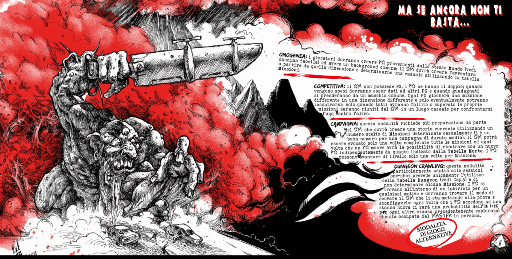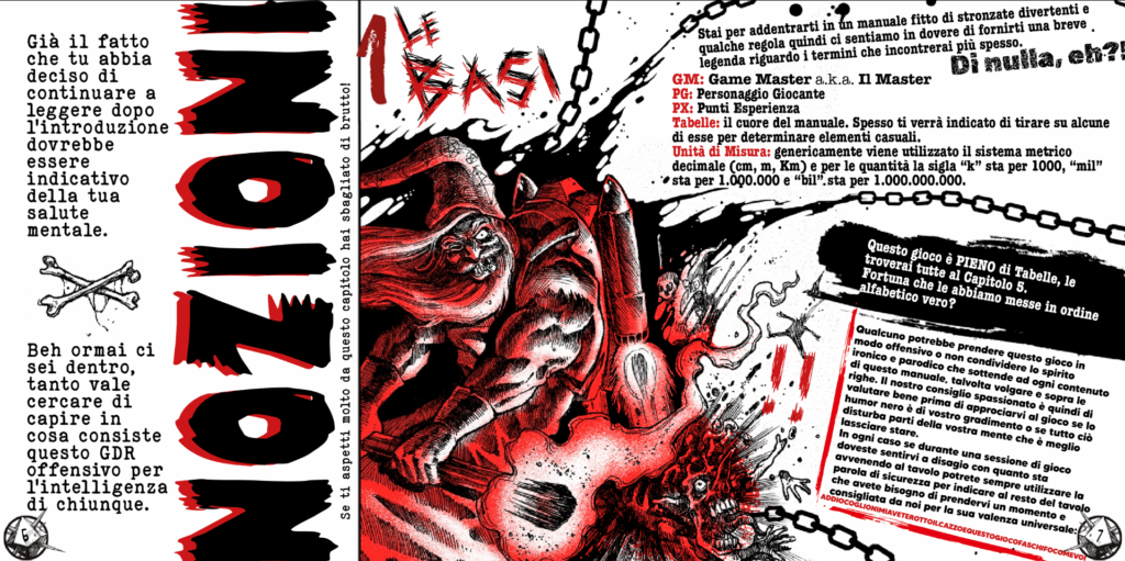 La componente parodica non è un semplice contorno: è l’ossatura del gioco. Il manuale è scritto con un linguaggio volgare, sarcastico e provocatorio. Frasi come “se non ti diverti cambia gioco!” o la breve e facilissima da ricordare parola di sicurezza “ADDIOCOGLIONIMIAVETEROTTOILCAZZOEQUESTOGIOCOFASCHIFOCOMEVOI” mettono in chiaro da subito il tono del prodotto. Ma dietro l’insulto c’è una lucida consapevolezza delle debolezze strutturali di molti giochi OSR ed una feroce critica alla sacralizzazione della figura del GM, alla rigidità delle ambientazioni ed alla narrazione autoreferenziale.