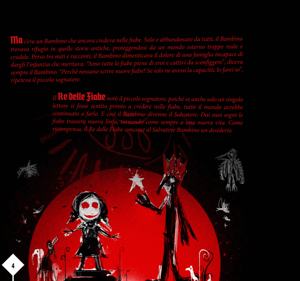 Dal punto di vista contenutistico, il manuale non si limita a offrire le regole ma include numerosi Scenari completi, ciascuno basato su una fiaba spezzata. Storie come “Iskra dal Cappuccio Rosso” o “Il Riflesso di Tuvstarr” offrono ambientazioni ricche, dilemmi morali, e trame gotiche perfettamente in linea con l’estetica del gioco. Ogni Scenario può essere giocato singolarmente o come parte di una Campagna ed alcuni sono accompagnati da Doni esclusivi o condizioni particolari che ne modificano le meccaniche.