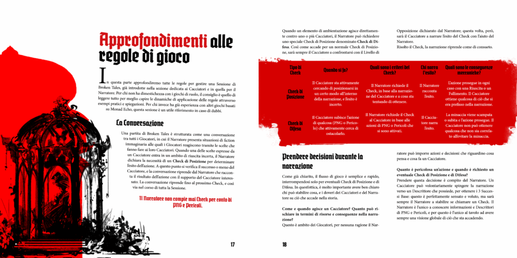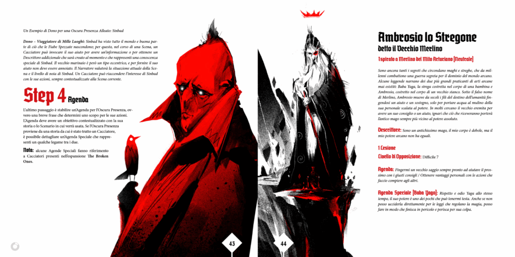 Il manuale fornisce anche una ricca sezione dedicata al ruolo del Narratore, offrendo strumenti dettagliati ma flessibili per la gestione degli Scenari. Piuttosto che presentare avventure lineari, Broken Tales abbraccia una struttura emergente: ogni Scenario è supportato da un Albero di Scene e da una serie di Agende per i PNG, che si evolvono in risposta alle azioni dei Cacciatori. Ciò garantisce grande rigiocabilità e stimola l’improvvisazione, pur fornendo tracce chiare per costruire una storia coerente.
