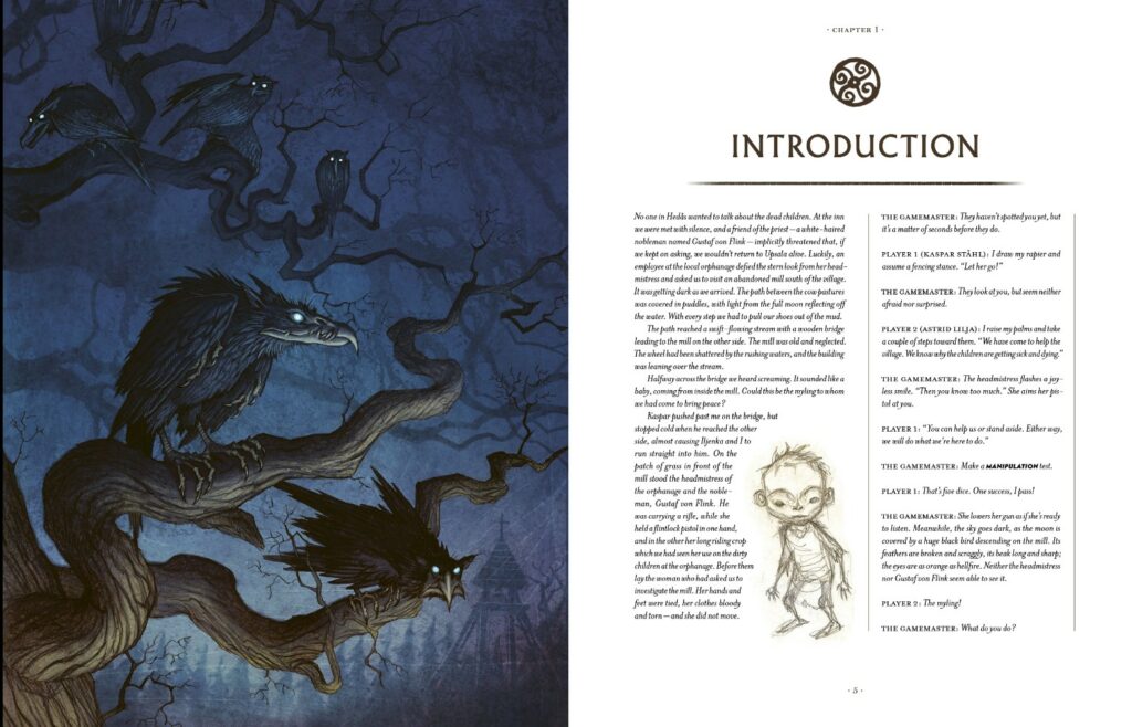 Il Narratore (GM) ha un ruolo centrale e ben supportato, i capitoli finali del manuale forniscono strumenti dettagliati per costruire misteri, gestire le scene e mantenere il tono desiderato. Le storie possono inclinarsi verso l’orrore puro, il dramma umano o l’indagine deduttiva, a seconda dello stile del gruppo. Il capitolo dedicato ai vaesen descrive ventuno creature diverse, tutte tratte dal folklore nordico ma rielaborate in chiave inquietante e poetica, ciascuna con poteri propri, regole uniche e debolezze esoteriche.