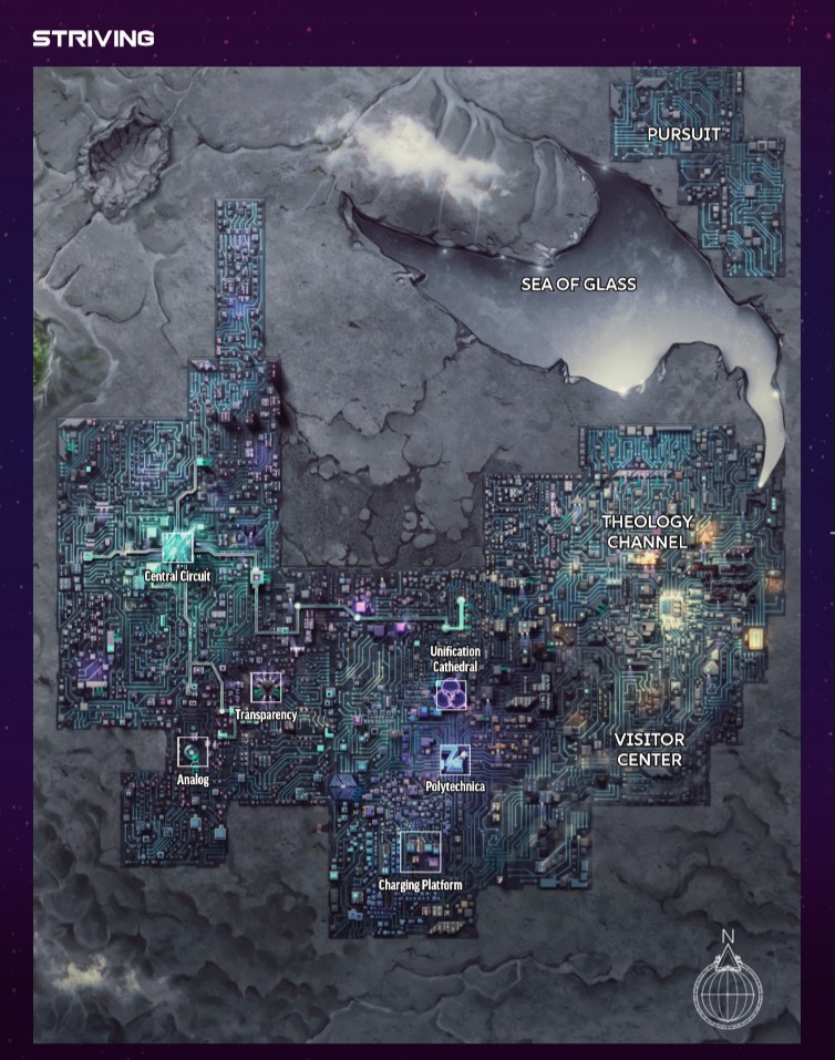 Nel secondo capitolo, Seekers in Striving, l’indagine si espande e diventa più libera e modulare: i giocatori devono cercare indizi su relitti tecnologici antichi e su strane sparizioni che coinvolgono il culto dei First Ones, misteriosa progenie degli anaciti. I personaggi sono incoraggiati a immergersi nell’ecosistema urbano: possono assumere lavoretti, infiltrarsi nei database, manipolare i media o cercare aiuto tra le molteplici fazioni presenti nella città. Le sfide sono pensate per favorire la varietà e incoraggiare creatività: dialoghi, hacking, stealth, diplomazia, scelte morali. Il modulo qui si arricchisce anche di sottotrame legate alle religioni tecnologiche di Aballon, con una sezione dedicata che ne esplora ideali, rituali e contrasti interni. L’interazione con la cosiddetta Machine Court, autorità legale cittadina, introduce una tensione crescente, che si manifesta in minacce legali, sorveglianza costante e manovre politiche oscure.