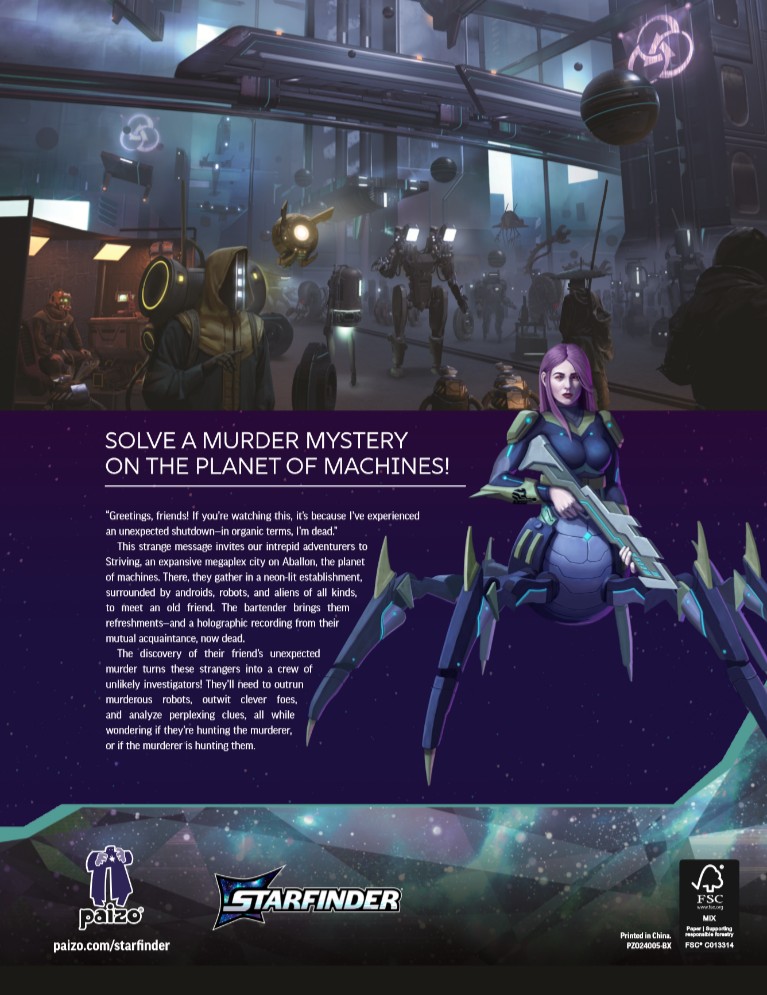 In definitiva, Murder in Metal City rappresenta non solo un eccellente punto d’ingresso nella Seconda Edizione di Starfinder, ma anche un modello di avventura investigativa fantascientifica ben scritta, ricca di atmosfera, varietà e profondità. Offre una visione densa e affascinante di Aballon, trasportando i personaggi in una storia che, pur centrata su un singolo omicidio, si apre a temi più ampi: l’identità delle intelligenze artificiali, il peso della memoria, il valore del passato dimenticato. È un debutto narrativo e meccanico brillante per la nuova edizione del gioco, che lascia ben sperare per i futuri sviluppi della linea editoriale sci-fi di Paizo.