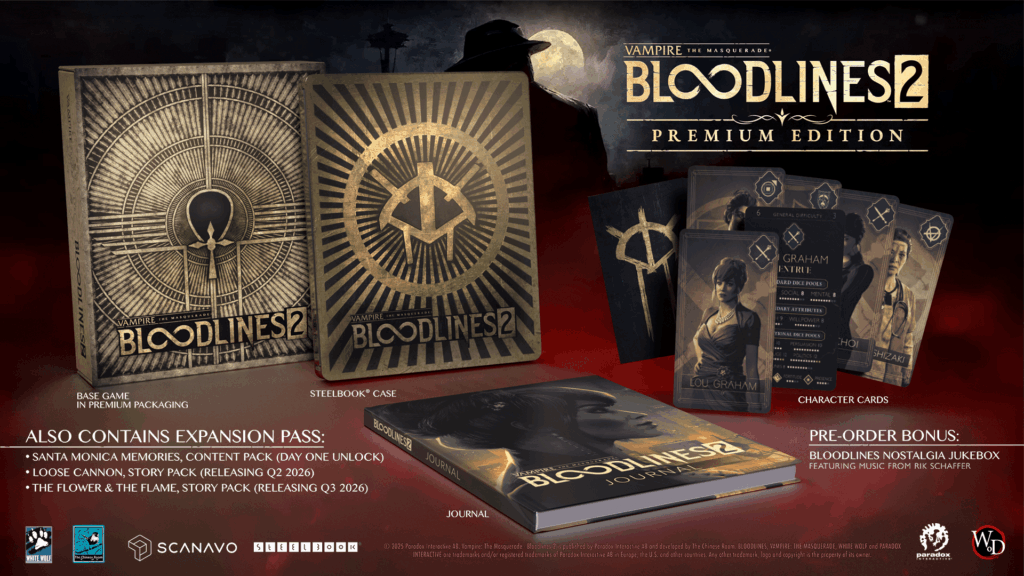 - Vampire: The Masquerade – Bloodlines 2: Premium Edition (prezzo consigliato €89.99) include il gioco base, il bonus di preordine Bloodlines Nostalgia Jukebox, l’Expansion Pass, cinque carte personaggio, un diario e una custodia Steelbook, il tutto confezionato in una scatola premium.