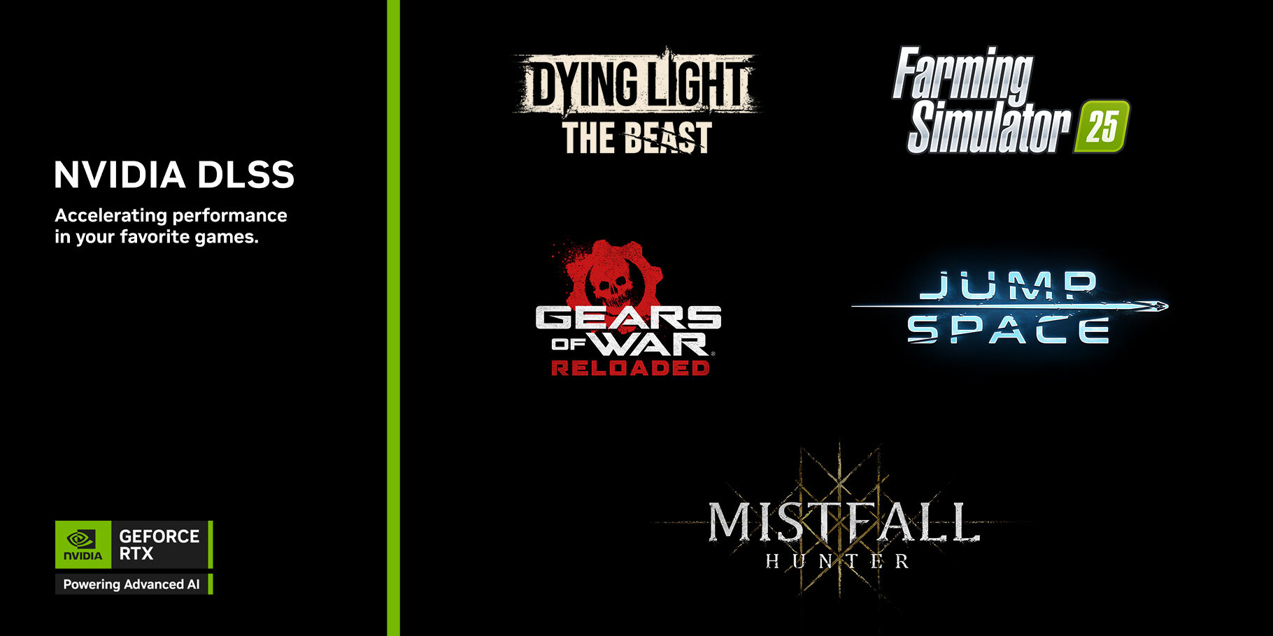 Oggi, DLSS 4 con Multi Frame Generation moltiplicherà le prestazioni in Dying Light: The Beast. DLSS 4 con Multi Frame Generation è disponibile anche in Farming Simulator 25 e nella Closed Beta di Mistfall Hunter. Inoltre, si aggiungono alla line-up Jump Space, che debutta con DLSS Super Resolution, e Gears of War: Reloaded, già disponibile con supporto a DLSS Super Resolution.