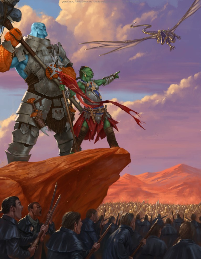 A legare tutti questi blocchi meccanici c’è una cornice narrativa molto piacevole, “A Reporter’s Journey into War”, che segue la giornalista Arianna Dreth mentre documenta il conflitto e, soprattutto, l’incontro tra l’orc comandante Ulka Oathshriek e il jotunborn guardiano Grimmyr. I loro scontri con pirati, draghi e agenti di Cheliax fungono da filo conduttore tra i capitoli, mostrando esempi concreti di utilizzo delle regole senza trasformarsi in un’avventura precostruita.