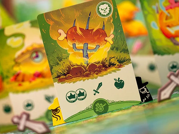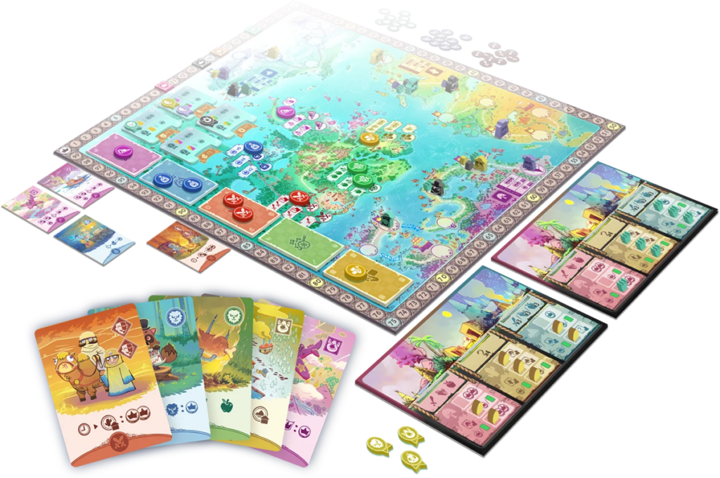 Navoria colpisce subito anche per il colore e l’impatto sul tavolo. Illustrazioni, tabellone e componenti hanno una coerenza rara, perché Meng Chunlin è autore, illustratore e direttore artistico. Questa visione unica si riflette in ogni elemento, dalla mappa alle icone, fino alle plance e ai tanti irresistibili meeple in legno.