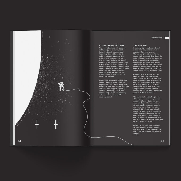 L’ambientazione di Tenebris è delineata con tratti netti ma non soffocanti. L’Iron Ring, un enorme anello costruito con relitti e moduli industriali, funge da centro economico e sociale, ed è popolato da recuperatori, culti del Vuoto, corporazioni decadenti e intelligenze artificiali mercenarie. Non c’è un eccesso di lore enciclopedico, ma una serie di spunti, fazioni e tensioni pronti per essere utilizzati, lasciando ampio spazio all’interpretazione e alla personalizzazione da parte del tavolo.