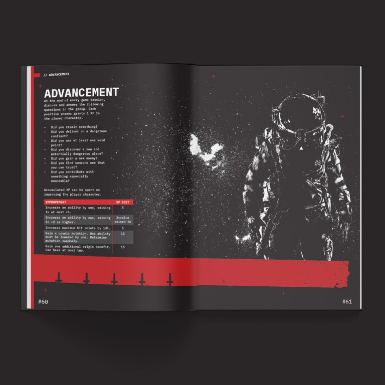 Le caratteristiche sono quattro, Corpo, Destrezza, Scaltrezza e Tecnologia, e vengono generate con un sistema rapido che produce valori spesso modesti o persino negativi, rafforzando l’idea che i personaggi non siano individui eccezionali ma lavoratori del vuoto, specializzati in alcune aree e fragili in altre. La creazione del personaggio è uno dei punti di forza del gioco, perché riesce a costruire identità e tono con pochi elementi ma molto mirati. Le origini, che sostituiscono il concetto tradizionale di classe, sono archetipi narrativi e culturali più che ruoli meccanici, e definiscono il modo in cui il personaggio si è adattato a un universo ostile, che si tratti di un Punk cresciuto ai margini delle stazioni, di un Chrome modificato dal metallo o di un individuo segnato da stranezze temporali e cosmiche.