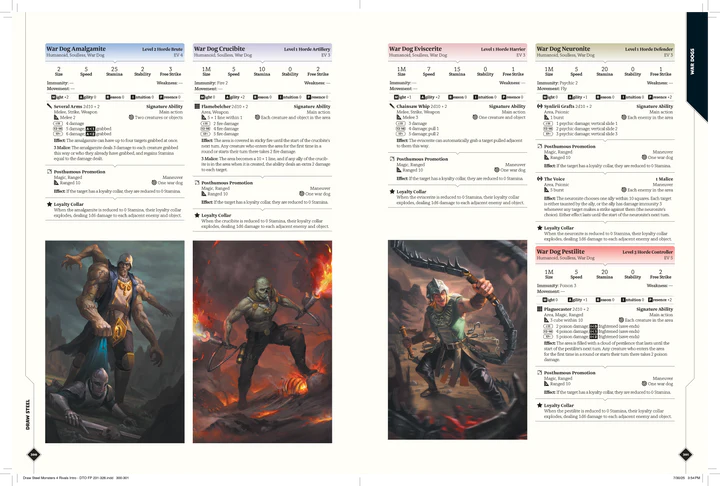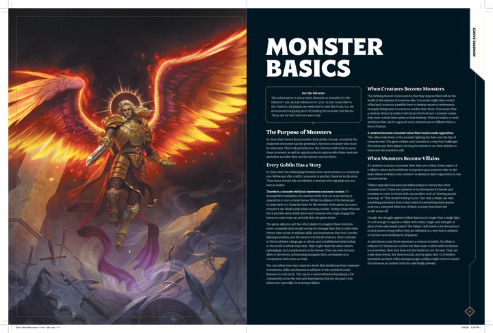 Uno degli aspetti più interessanti è la definizione concettuale di “mostro”. Nel sistema Draw Steel una creatura diventa mostro quando impone la propria volontà sul mondo a scapito di qualcun altro. Questa distinzione, apparentemente filosofica, ha implicazioni concrete al tavolo, perché consente di distinguere tra antagonisti morali, avversari temporanei e veri villain ricorrenti. Il manuale dedica ampio spazio a spiegare come un antagonista possa sopravvivere a uno scontro, ritirarsi, evolversi e tornare in scena, rafforzando l’idea di campagne costruite su conflitti persistenti invece che su incontri isolati.
